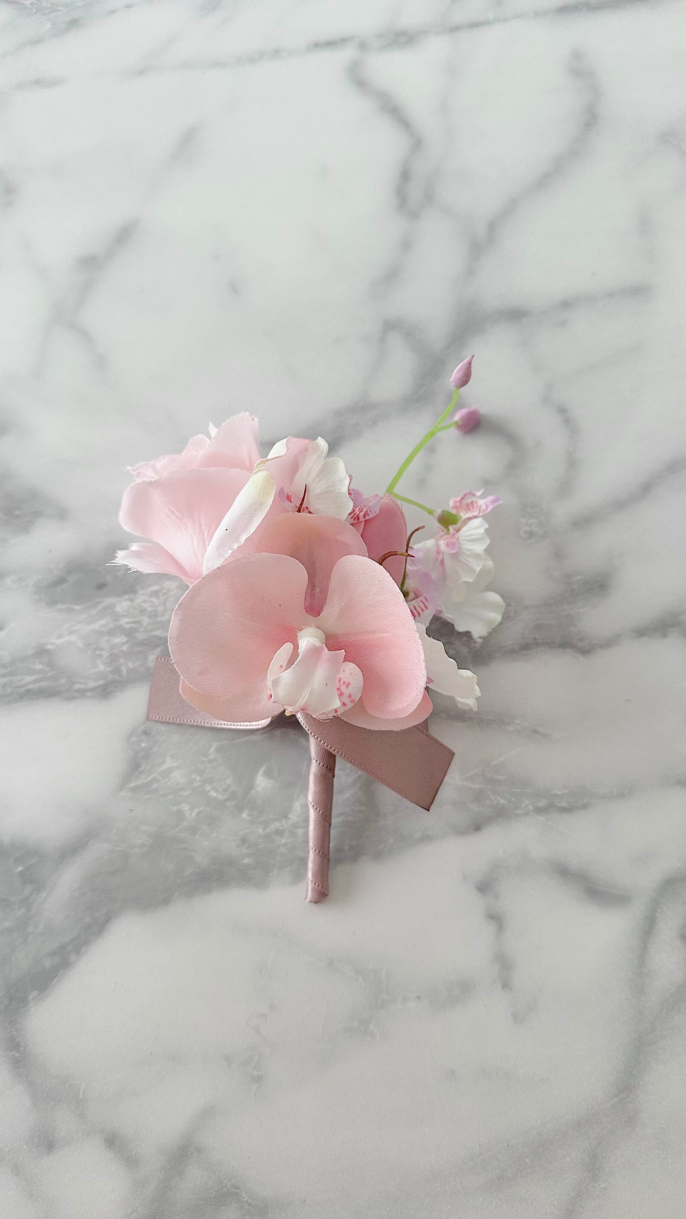 ミニ胡蝶蘭のロングリボンピンクブーケ