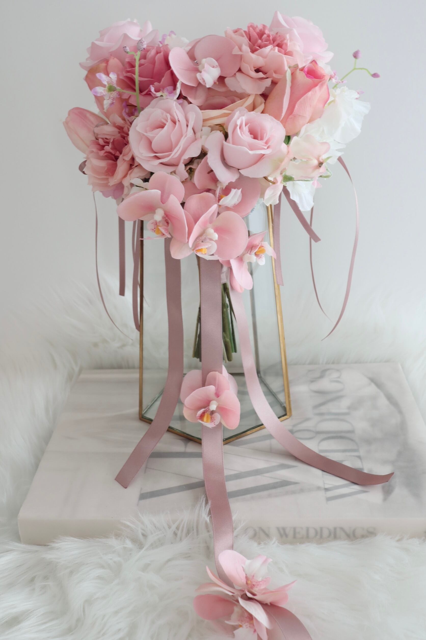 ピンクのグラデーションカラーに、長く垂らしたリボン×ミニ胡蝶蘭がポイントのブーケです。