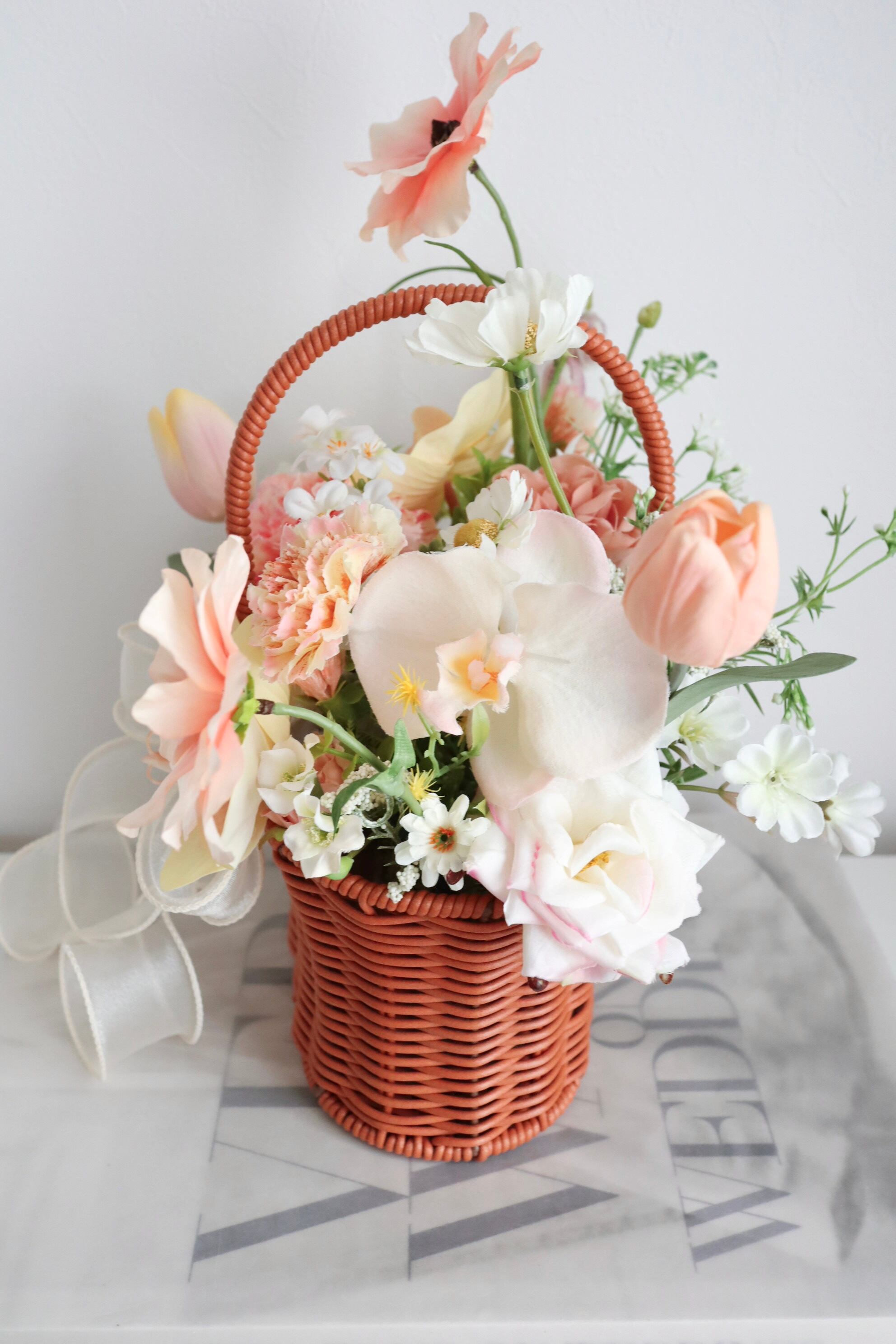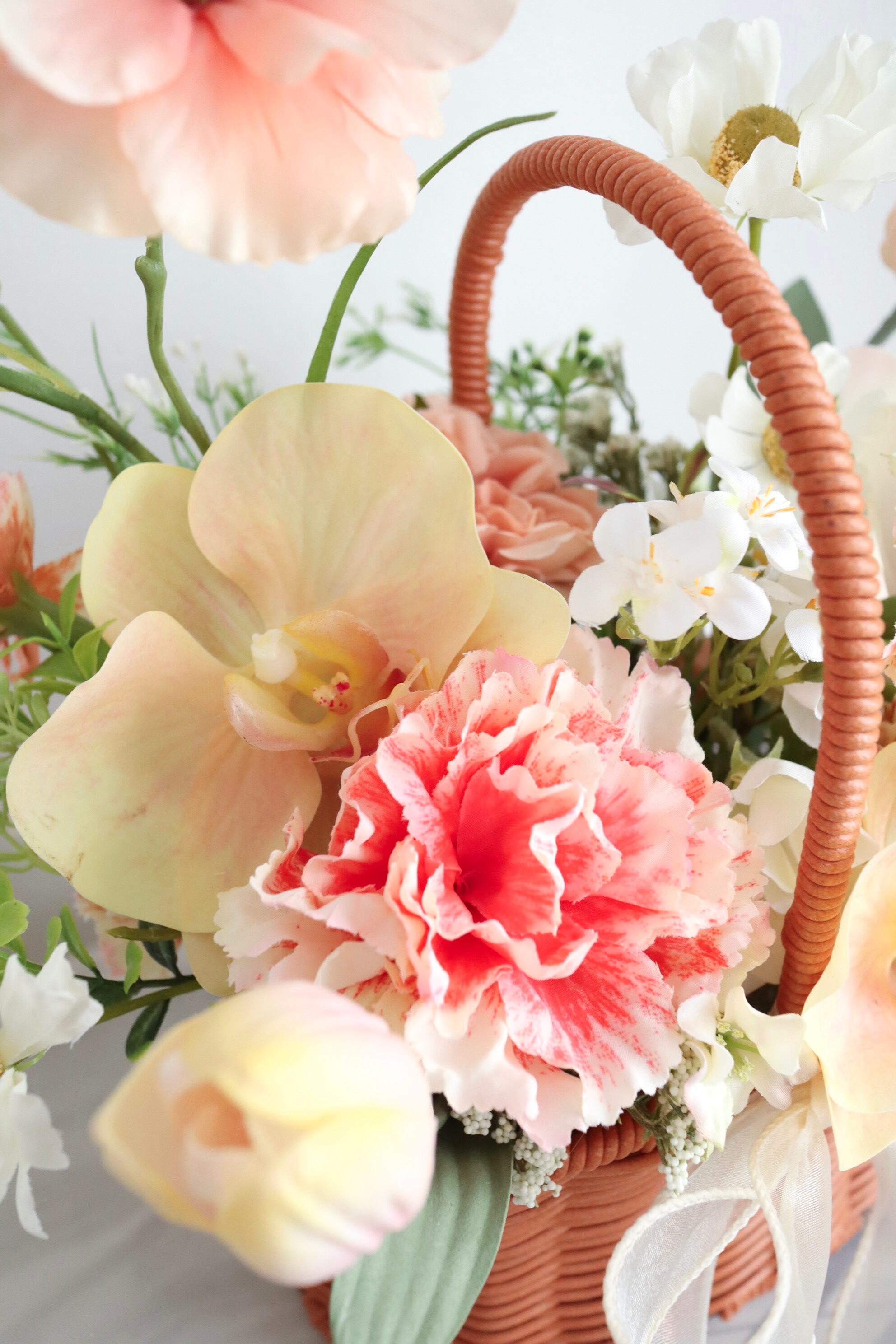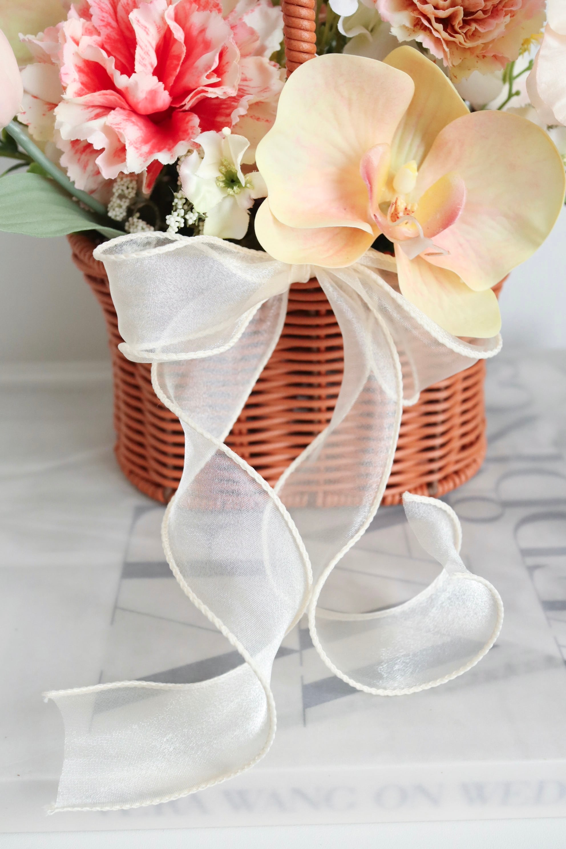 バスケットにはオーガンジーのリボンをお付けしているため、贈り物にもぴったりです。