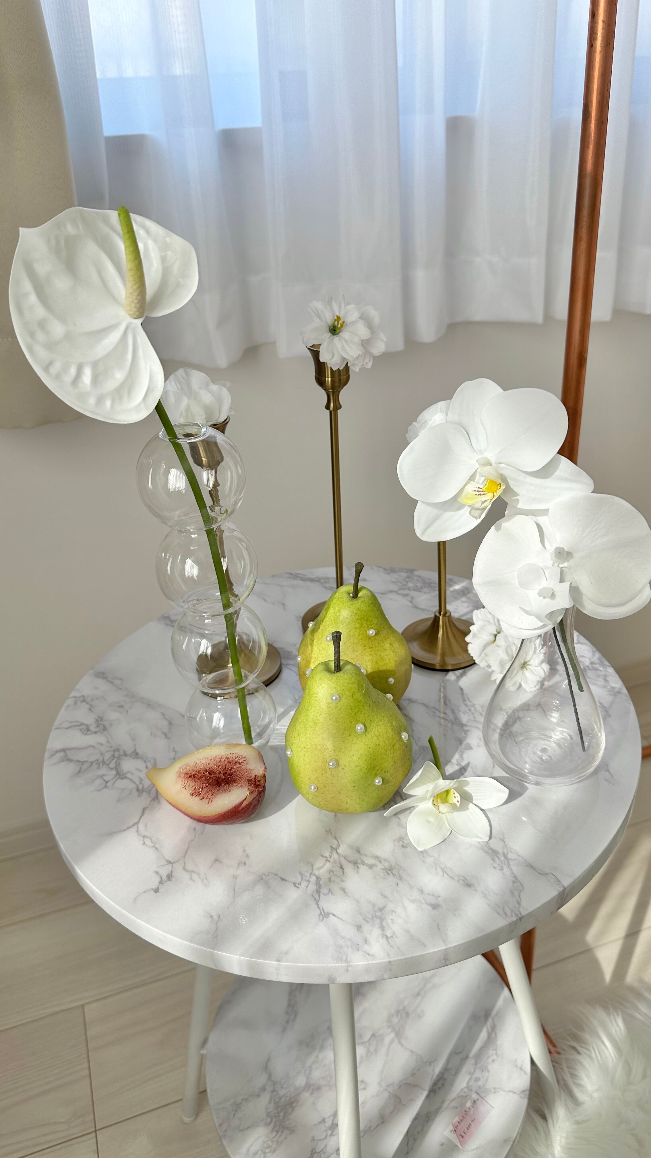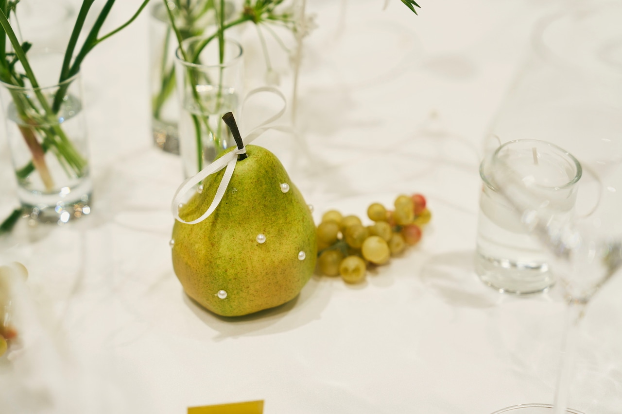 フルーツ、アーティフィシャルフラワー、花瓶、キャンドル&キャンドルスタンドなどがセットになった、ウェディング装飾用のセットです。