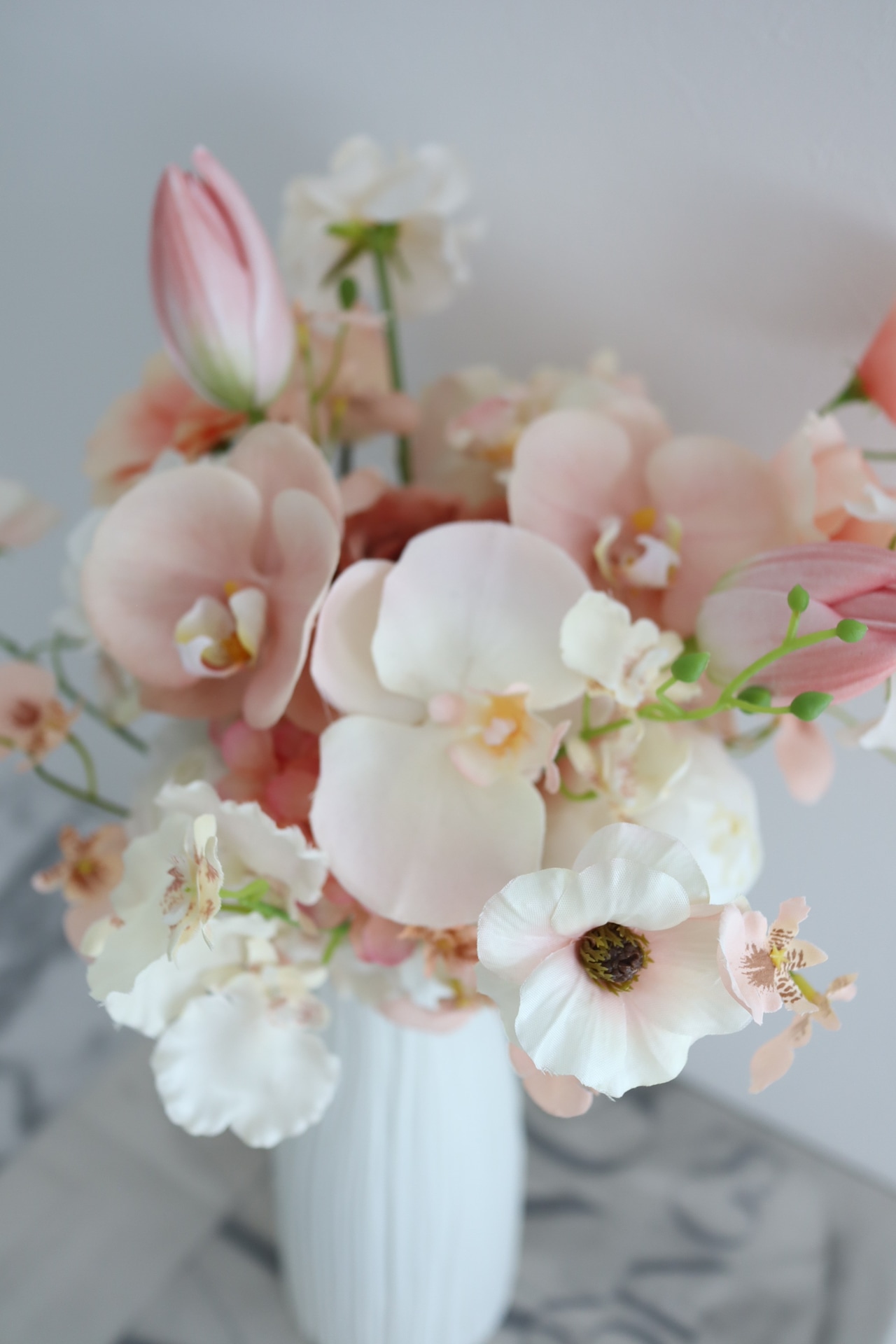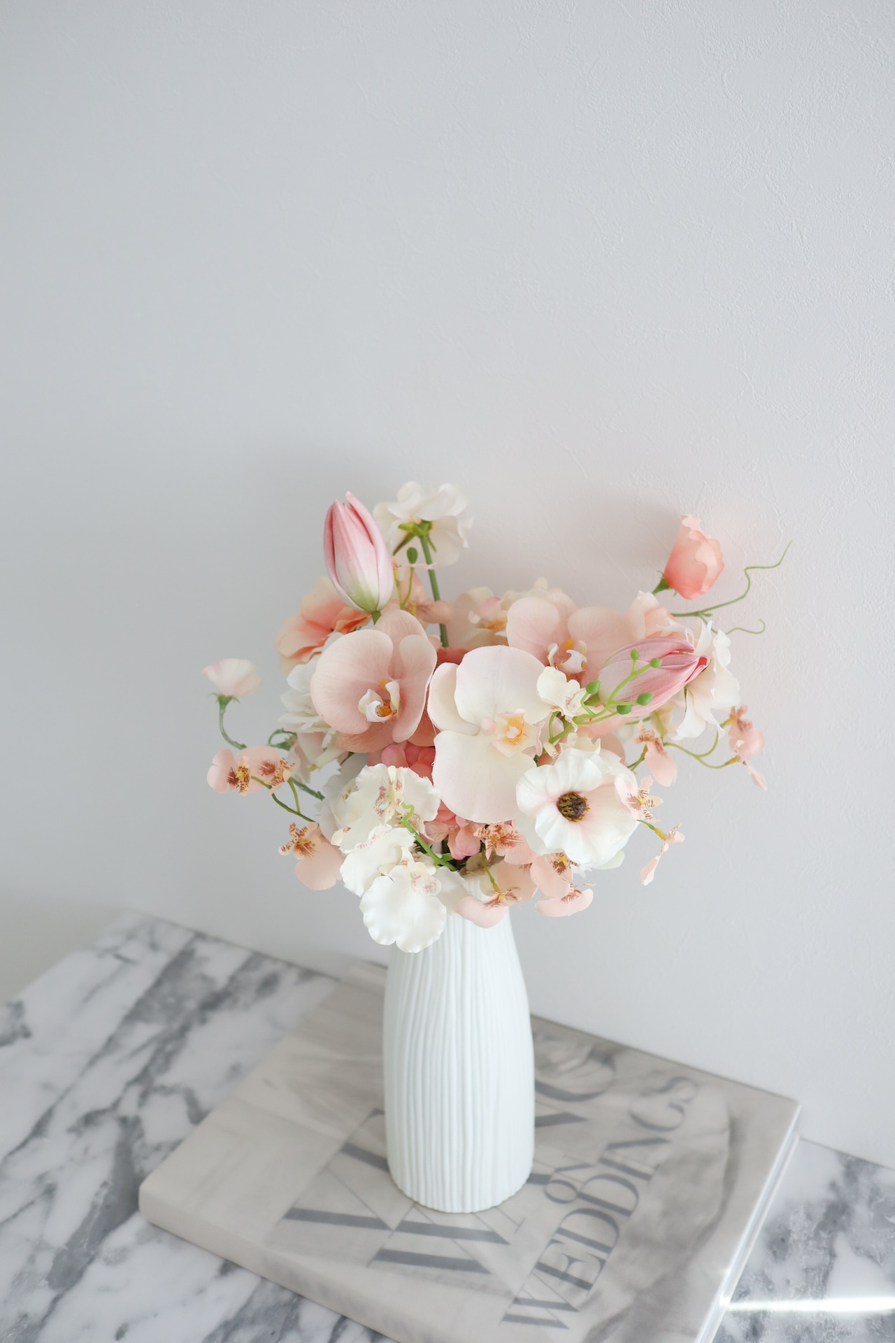 胡蝶蘭、スイトピー、チューリップ、オンシジューム、ラナンキュラス、小花など