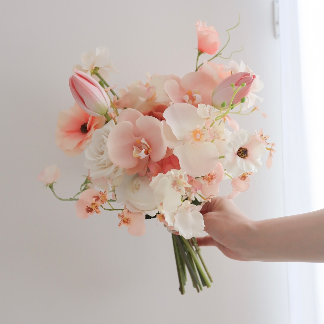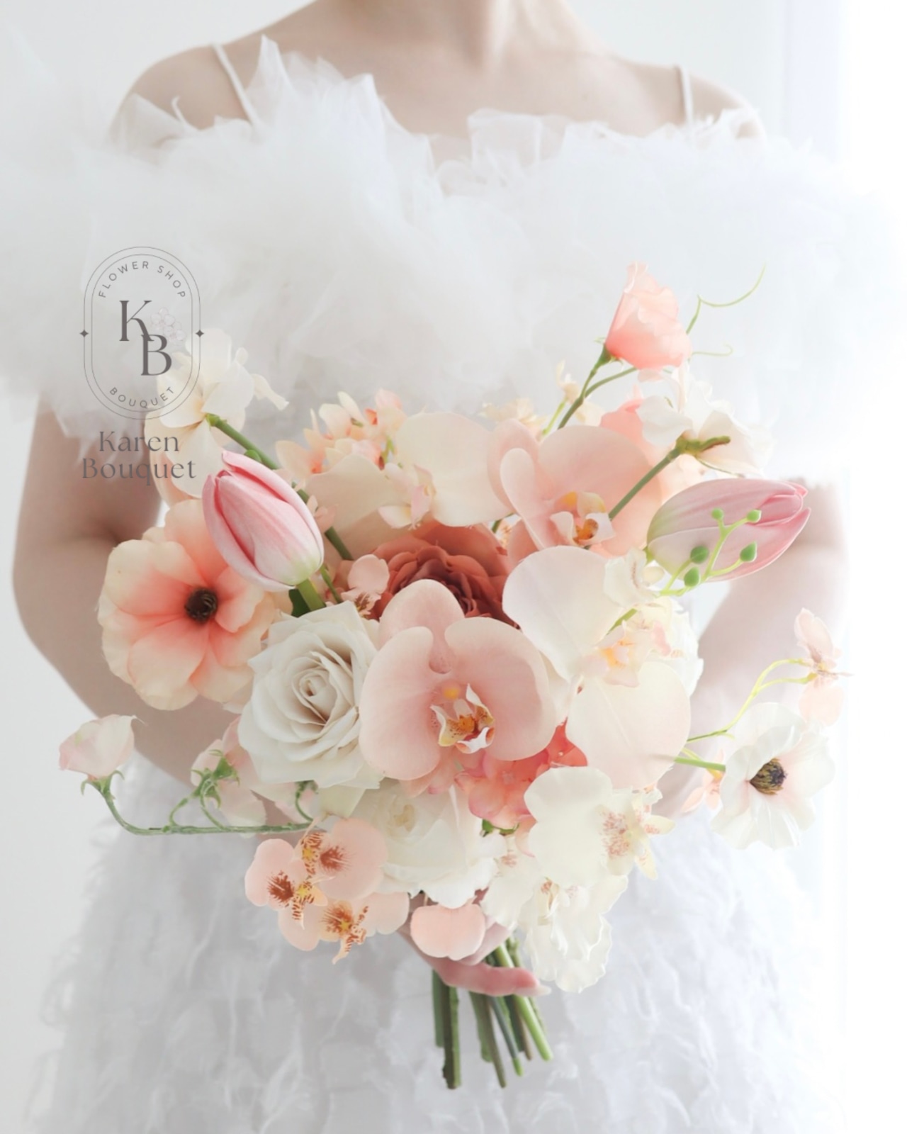 アプリコットカラーの胡蝶蘭をはじめ、優しいニュアンスカラーのお花でまとめたブーケです。