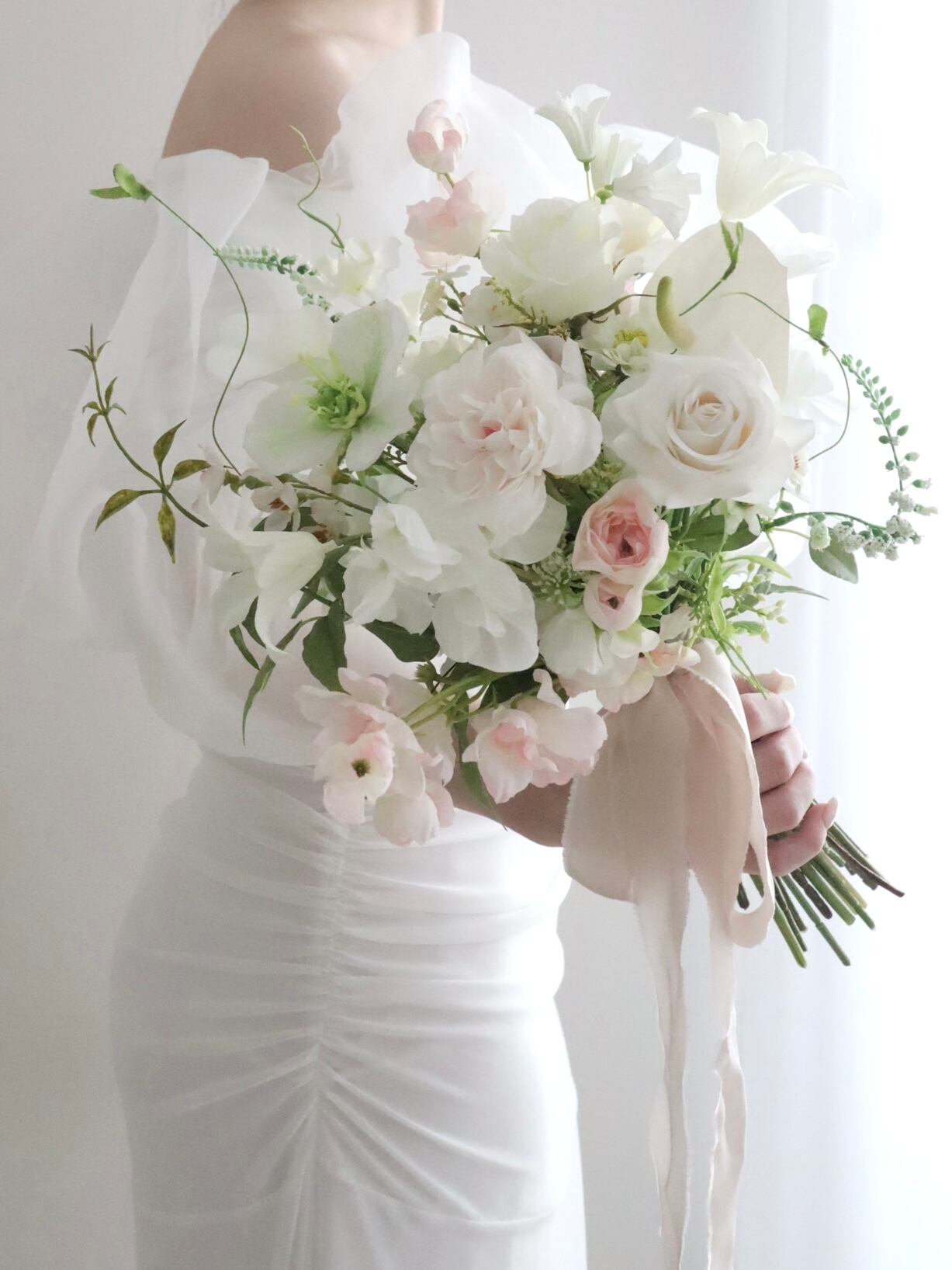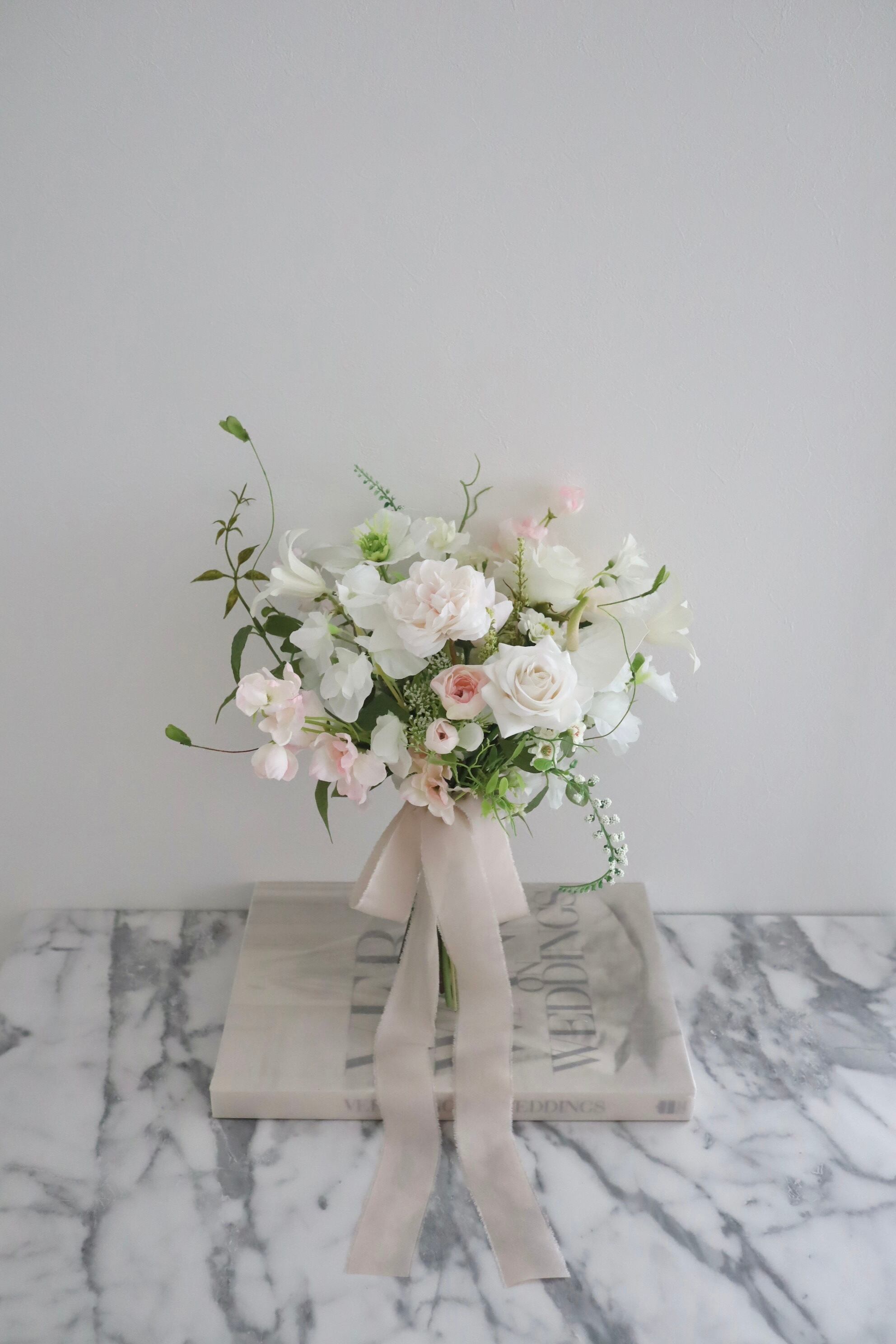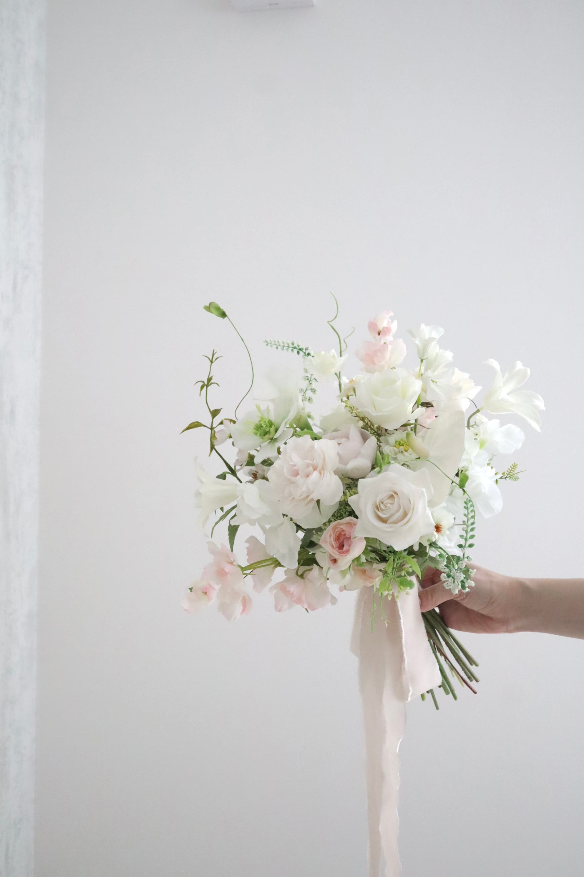 ウェディングシーンにぴったりなピュアホワイトに、淡いピンクをプラスして柔らかく透明感あるブーケに仕上げました。