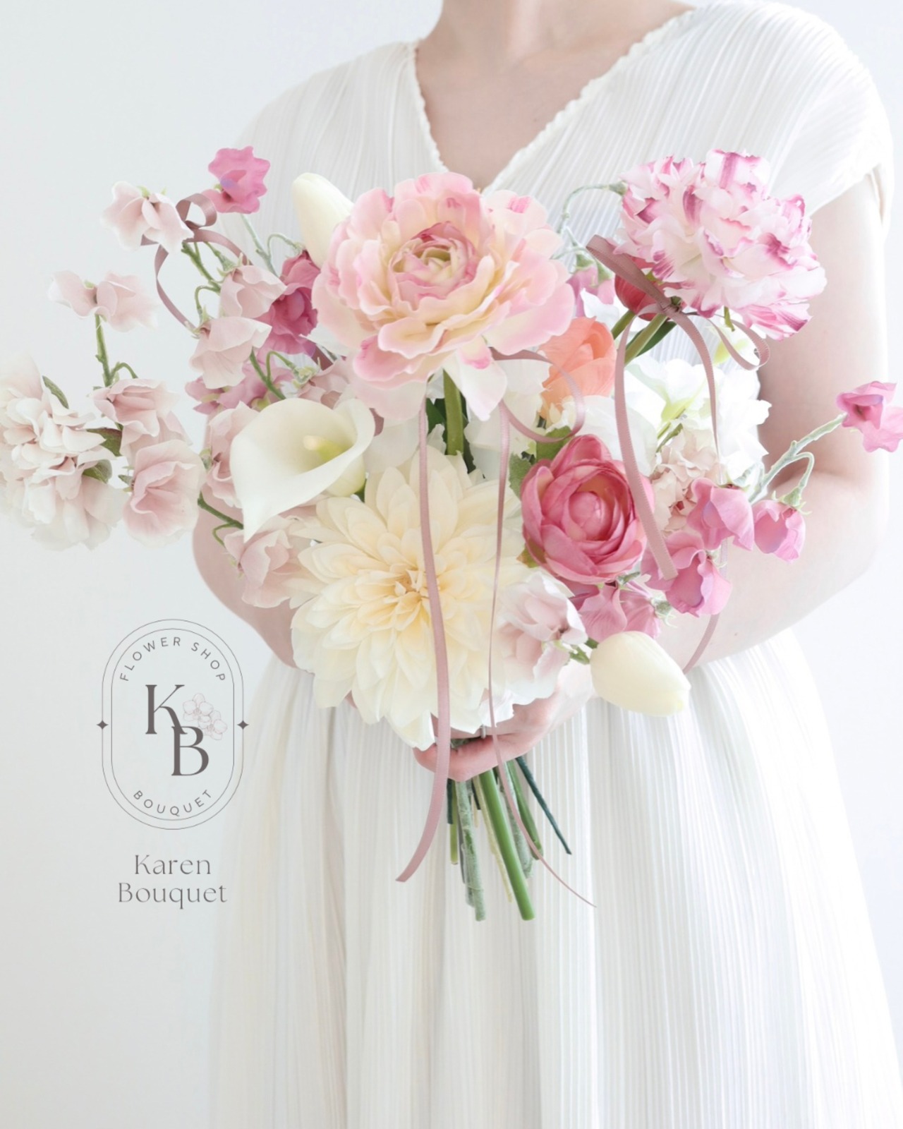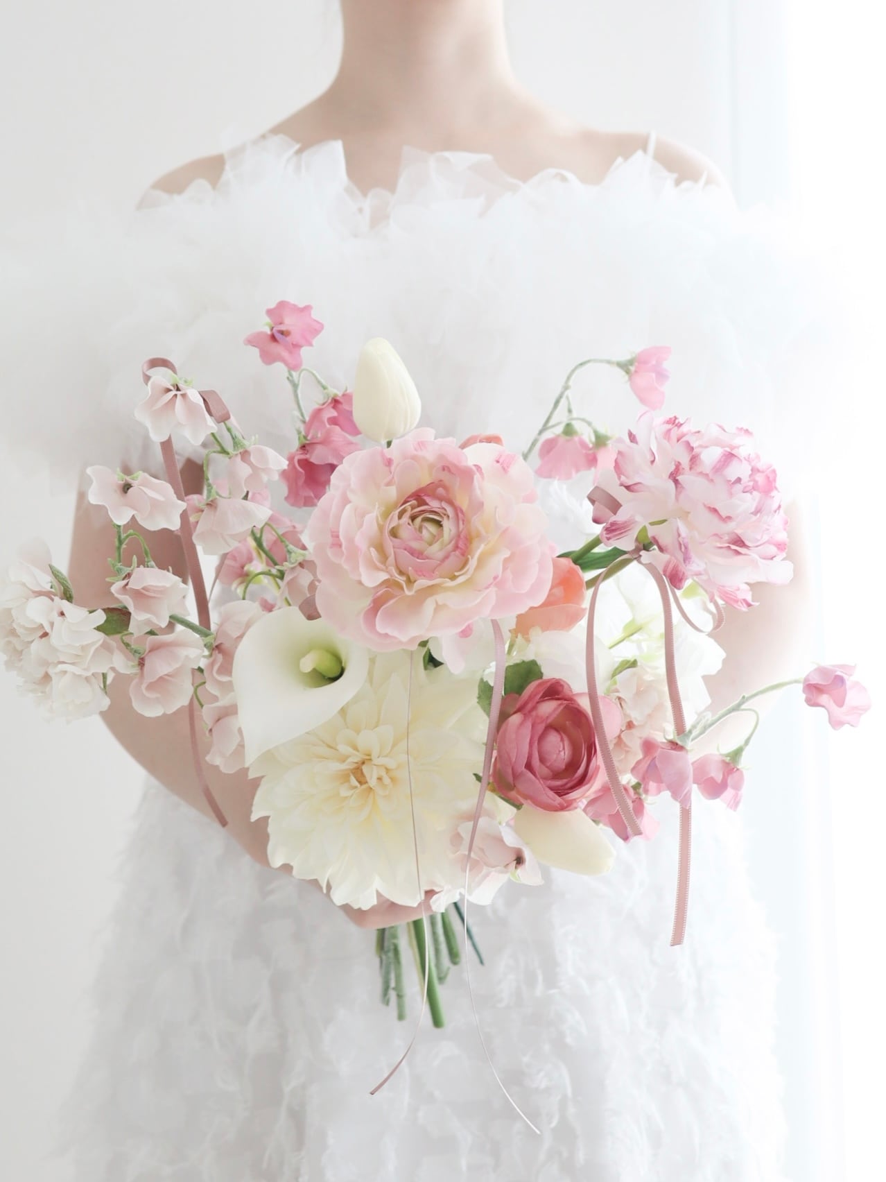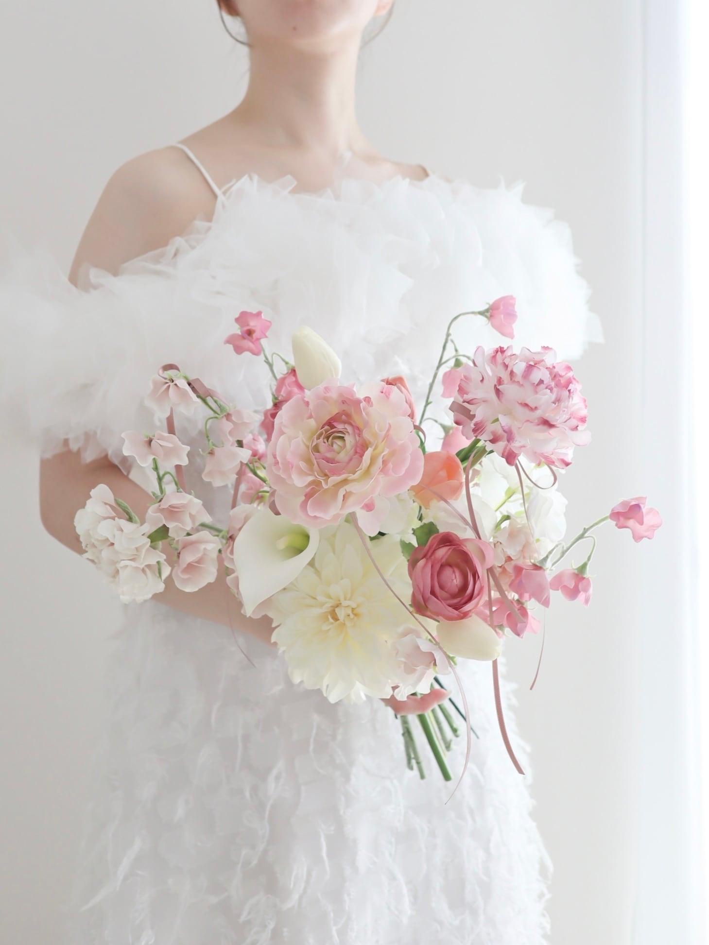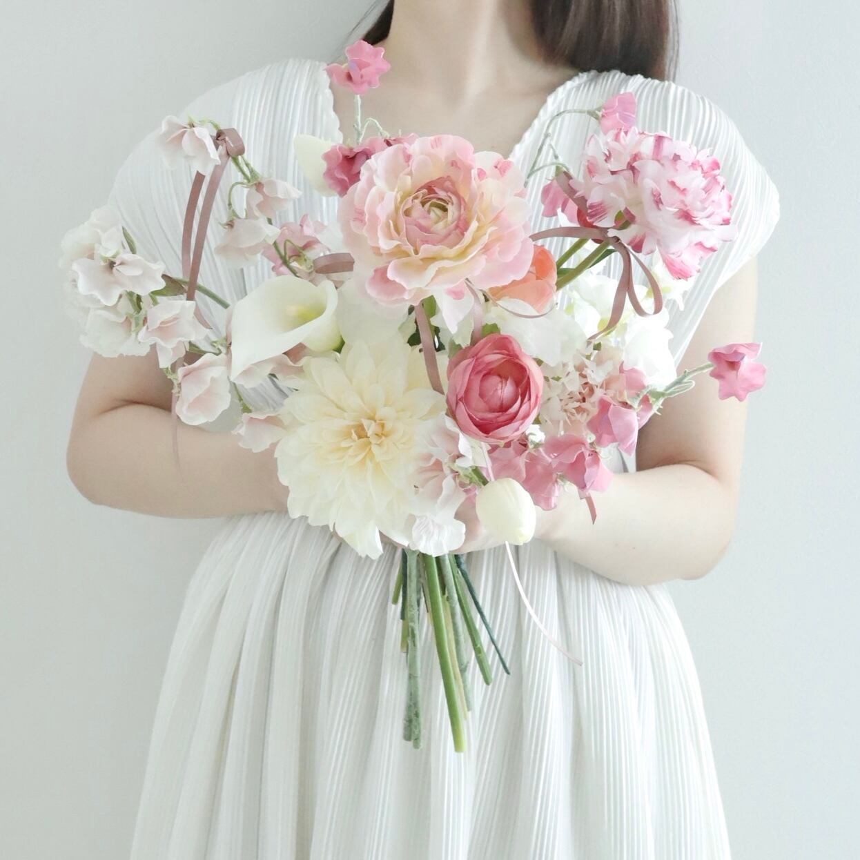 自分らしさ満載の大人可愛い花嫁様にお持ちいただきたく、トレンドのバレエコアをテーマにした可愛いデザインのブーケをお作りしました。