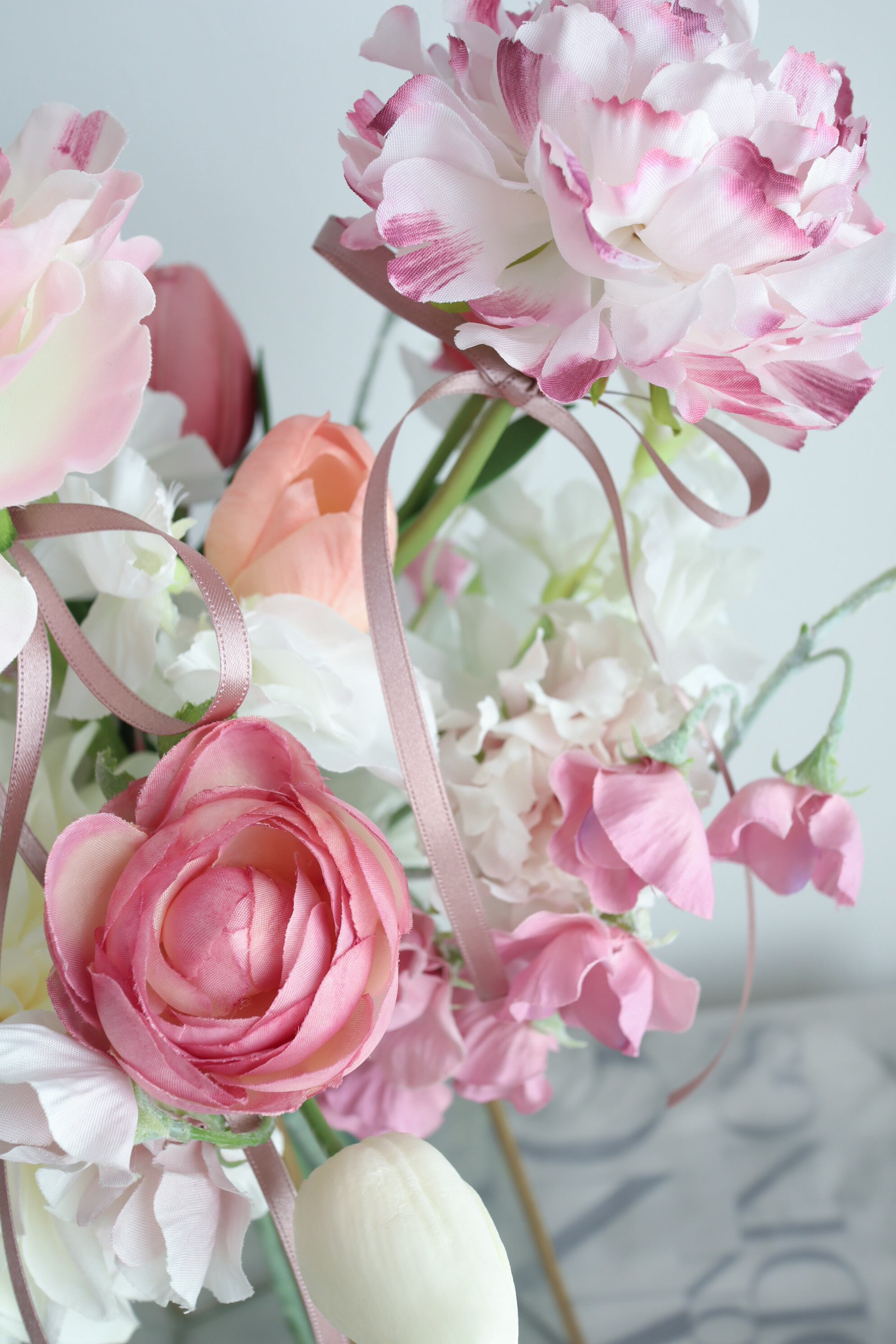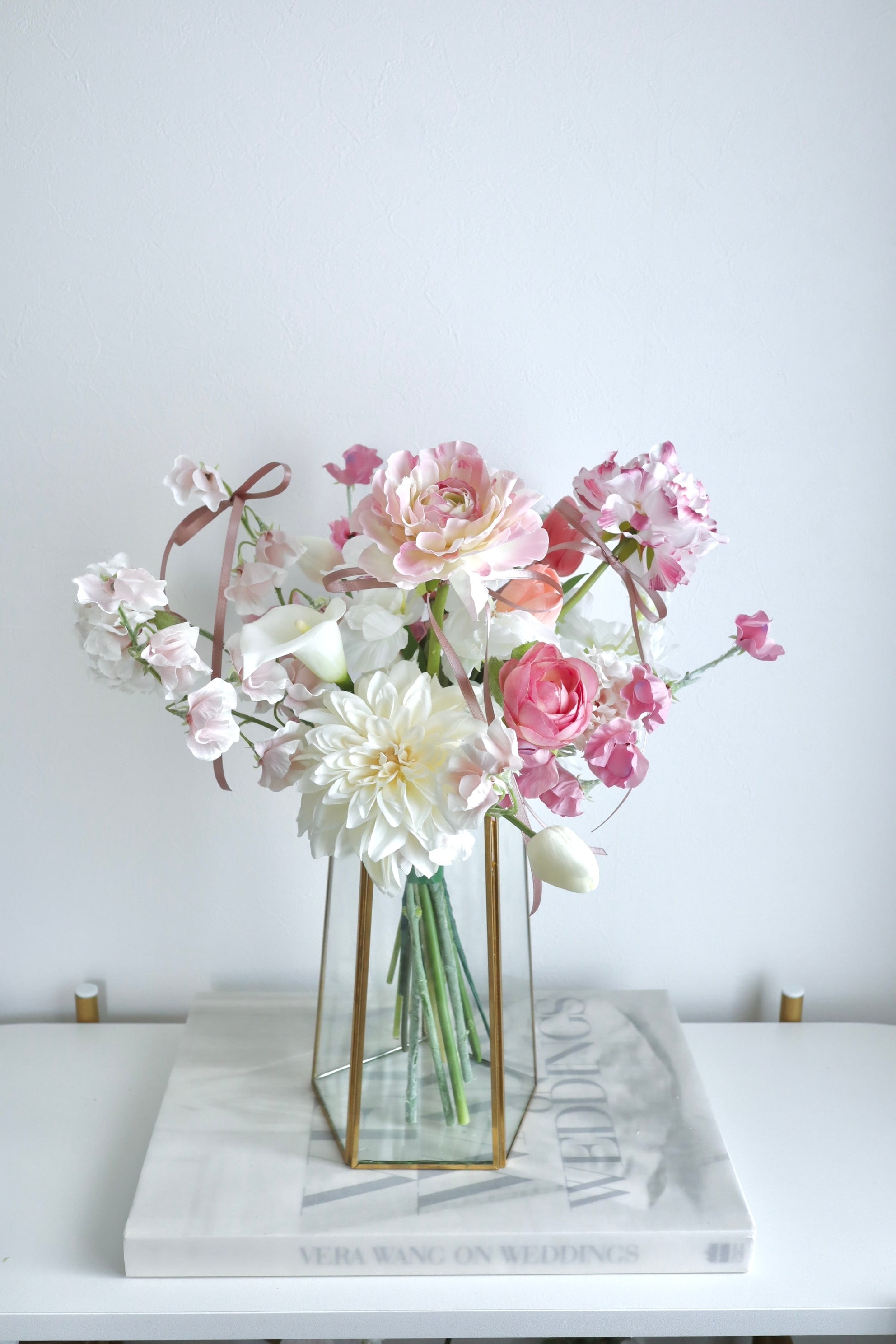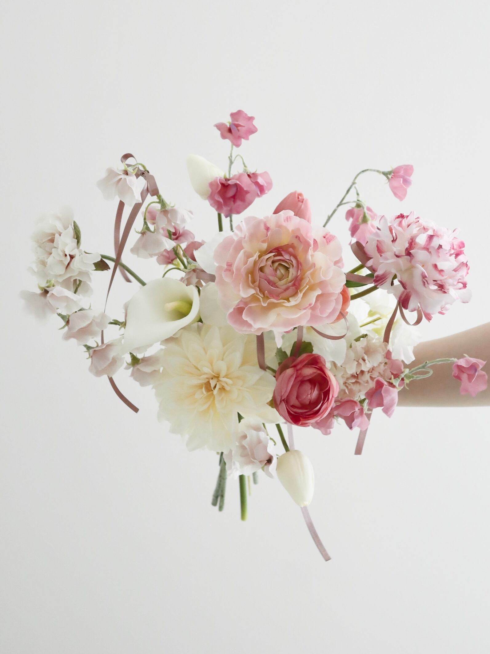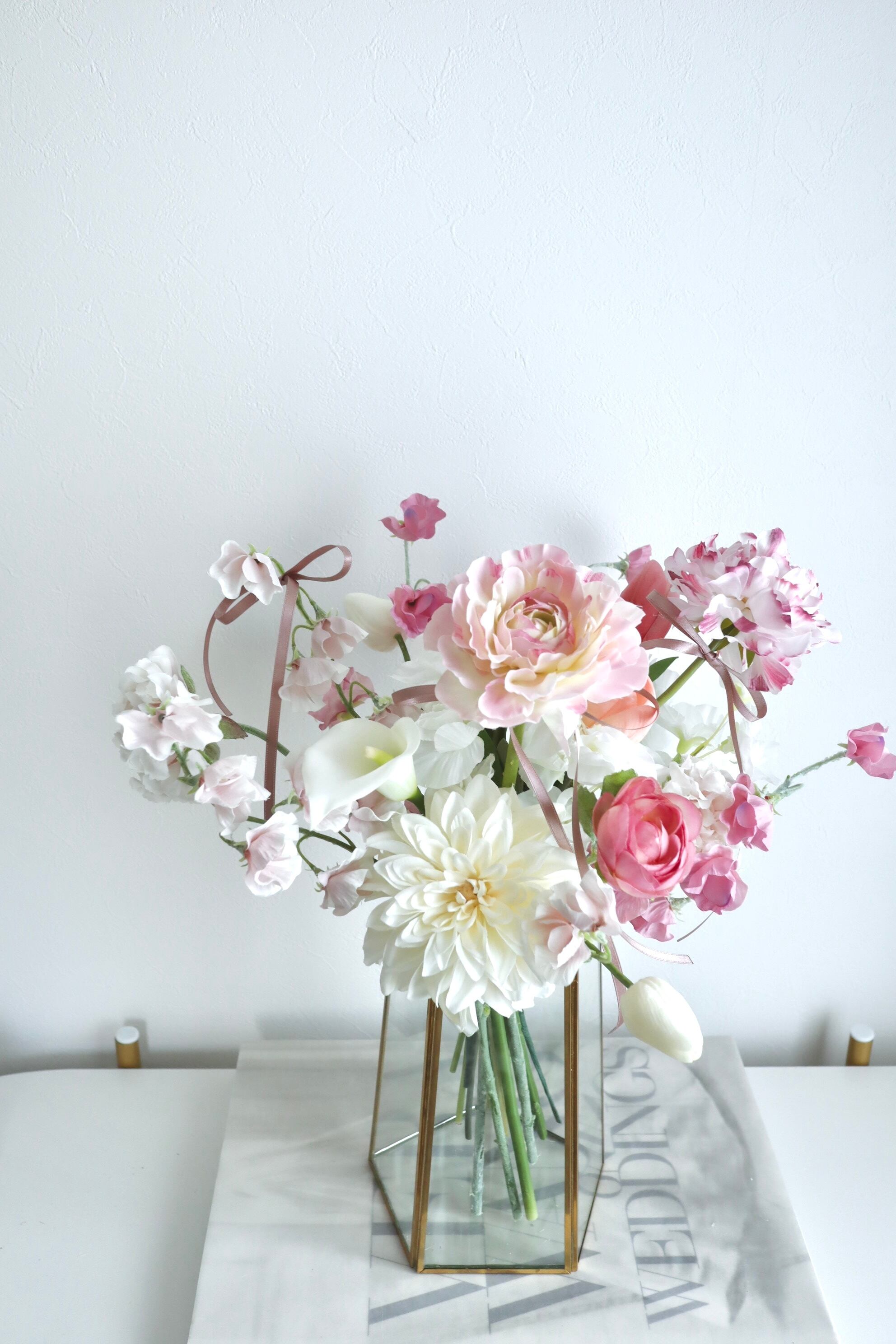 自分らしさ満載の大人可愛い花嫁様にお持ちいただきたく、トレンドのバレエコアをテーマにした可愛いデザインのブーケをお作りしました。