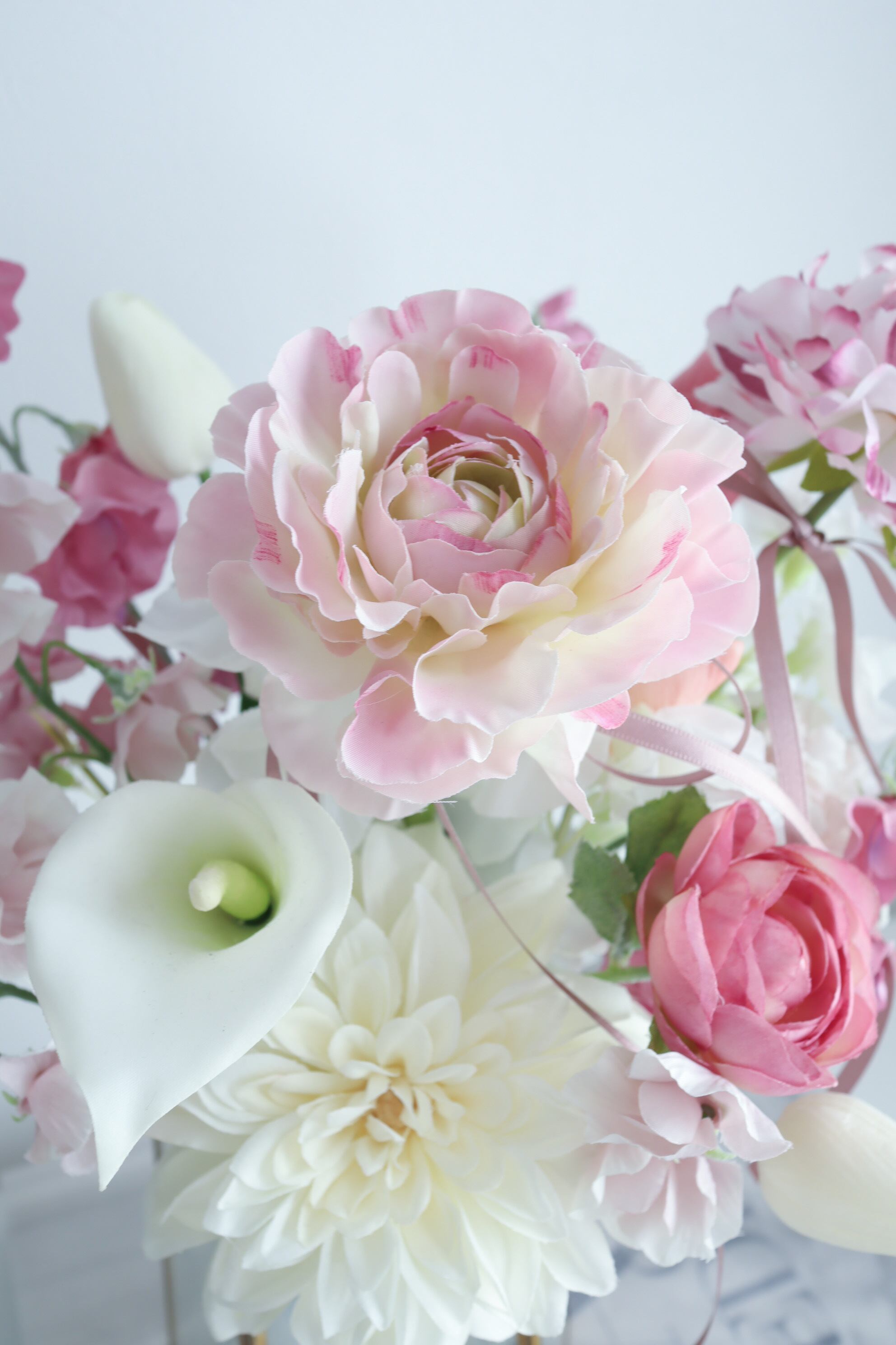 ピンクの可憐なラナンキュラスをプリンシパル(=バレエの主役)に見立ててふんわりと束ねたブーケ。